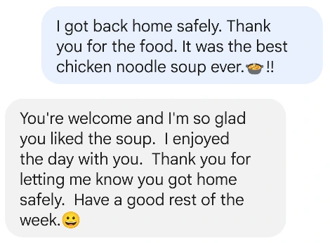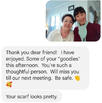우리는 매주 수요일에 만남을 가지고 있다. 일주일간 있었던 일에 대해 서로 이야기를 나누고 내게 영어도 가르쳐 주신다. 취미활동을 공유하기도 하고 한국의 문화를 소개해 드리기도 하며 종종 서로의 간식을 나누기도 한다. 한국의 명절에는 한국 음식을 만들어서 드리기도 하고 한국 과자를 인터넷으로 구입할 때면 맛보시라며 나누어 드리기도 한다. 올해 초에는 함께 뜨개질을 해서 목도리를 만들기도 했다. 지난번 재능기부 대학 수업을 앞두고서는 나의 발표 내용과 영어 발음을 검토해 주셔서 너무 감사했다.