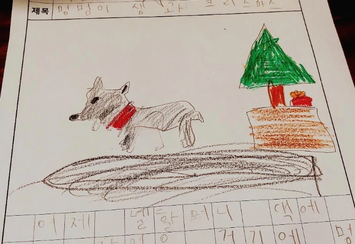 작년 겨울 크리스마스 때, 팬데믹으로 인해 가족 행사도 없었고 어딜 가자니 두려운 마음이 드는 것도 사실이었다. 하지만 넬께서 우리 가족 모두를 초대를 해 주셔서 맛있는 음식도 함께 하고 즐거운 시간을 보낼 수 있었다. 집에는 특별 손님으로 온 강아지가 우리를 반기고 있었다. 똘똘이가 심심할까 봐 옆집 아저씨께 부탁을 해서 빌려 온 강아지 샘이었다. 덕분에 똘똘이는 샘과 뱅글뱅글 거실에서 서로를 잡는 놀이?!를 하며 땀을 뻘뻘 흘릴 정도로 재미있게 놀았다. 그날 집으로 와서 쓴 똘똘이의 일기에는 당연히 강아지 샘이 등장을 했다.