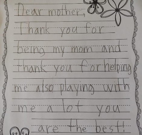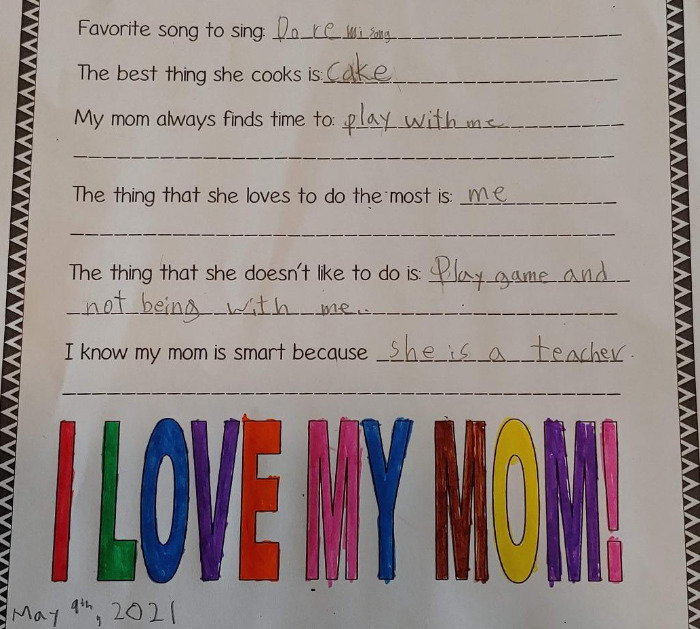 작년 5월 9일은 미국에서 마더스 데이(Mother’s Day), 즉 ‘어머니 날'이었다. 한국은 매년 5월 8일을 어버이날이라고 해서 부모님 모두께 감사한 마음을 전하지만, 미국은 어머니 날과 아버지 날을 따로 시행하고 있다. 매년 5월 둘째 일요일은 어머니 날(Mother's day)이고, 6월 셋째 일요일은 아버지 날(Father's day)에 해당한다. 작년 어머니 날에 이를 기념하며 학교에서 몇 가지 활동을 한 후 집으로 글과 그림을 가져온 적이 있다. 작품은 모두 3가지, 엄마에 대한 학습지, 엄마께 드리는 편지, 그리고 엄마를 위한 꽃이었다.