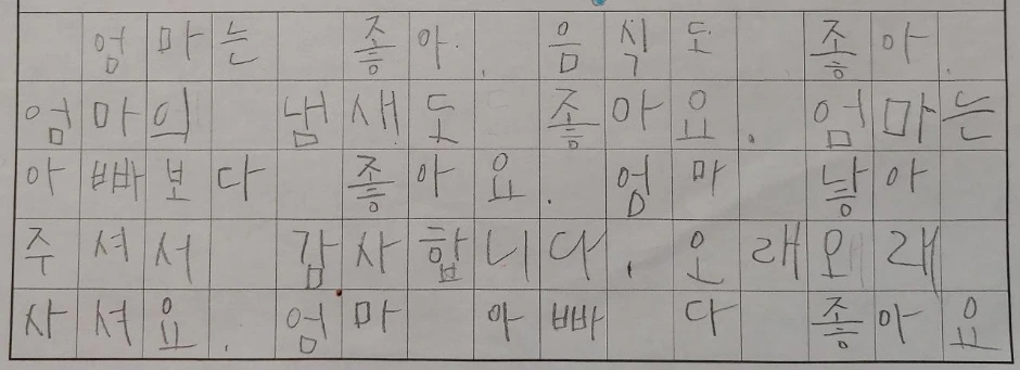 "근데 한 가지... 엄마는 아빠보다 좋아요. 이 문장은 아빠가 보면 약간 서운해하지 않을까?"