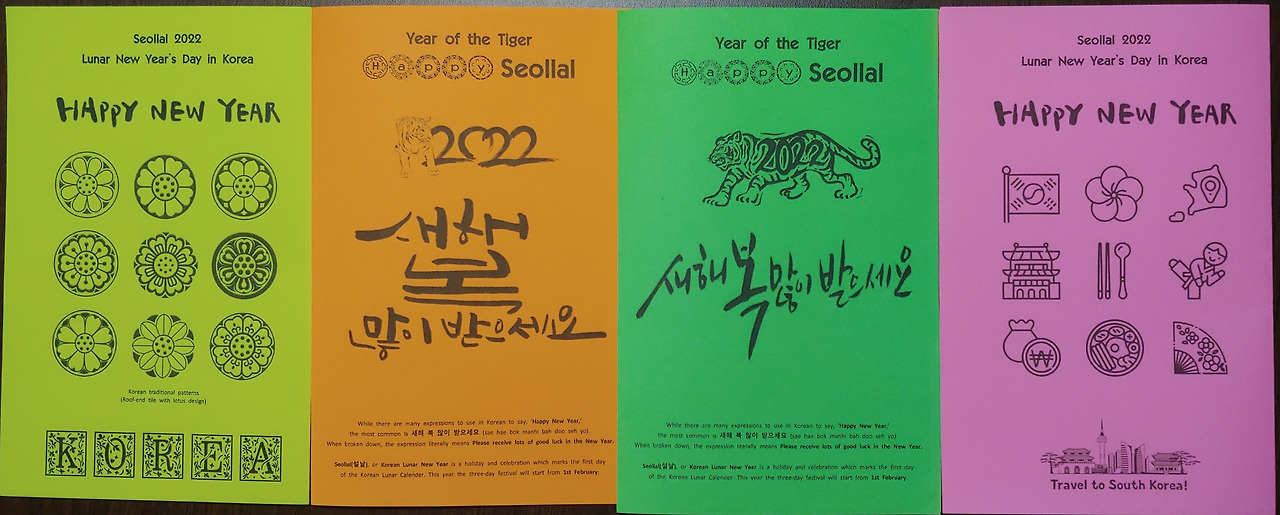 설날을 앞두고 연하장과 함께 새해 인사를 나눴다. 매해 설날이 되면 나는 연하장 양식을 만들고 색깔 종이에 프린트를 해서 주변 분들과 나눈다. 앞표지에는 그 해에 해당하는 동물 그림과 '새해 복 많이 받으세요' 문장을 넣고 하단에 이 말의 의미와 설날에 대한 간단한 소개를 넣는다. 미국 친구들이 이 연하장을 받았을 때 이해를 돕기 위해 생각해 낸 방법이다. 뒤표지에는 한국의 전통 문양과 한국을 대표하는 작은 그림을 배치한다. 색깔 종이 덕분에 흑백으로 인쇄를 해도 반으로 접으면 연하장으로 쓰기에 제법 훌륭하다.