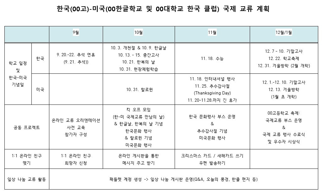 교류 프로그램 제안 메일을 받고 해 볼 수 있겠다고 야심 차게 답장을 바로 드리긴 했지만 사실 내게는 걱정이 많았다. 나의 열정!과 열망?만으로는 해 볼 수 있다고 생각을 했지만 한편으로는 내가 과연 할 수 있을까? 하는 근본적인 의구심이 들지 않을 수 없었다. 나는 미국에서 정식 교사가 아니기에 맡고 있는 반도 없고 담당하는 학생들이 있는 것도 아니었다. 무슨 배짱으로 이렇게 큰 일을 해 본다고 한 거지?