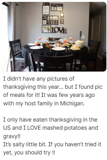 미국에 있는 학생들은 모두 긴 연휴를 즐기며 다양한 방법으로 추수감사절을 보냈다. 이후 각종 음식 사진, 상차림 사진, 함께 모였던 사람들과 찍은 사진 등과 함께 본인이 경험한 명절에 대한 소감을 온라인 게시판에 공유해 주었다. 많은 명절 음식 사진 중에서 단연 많이 올라온 사진은 터키였다. 추수감사절 음식으로 가장 유명한 음식은 터키, 칠면조 요리가 꼽힌다. 미국에서는 추수감사절 연휴 동안 엄청난 양의 칠면조가 소비되기 때문이다.