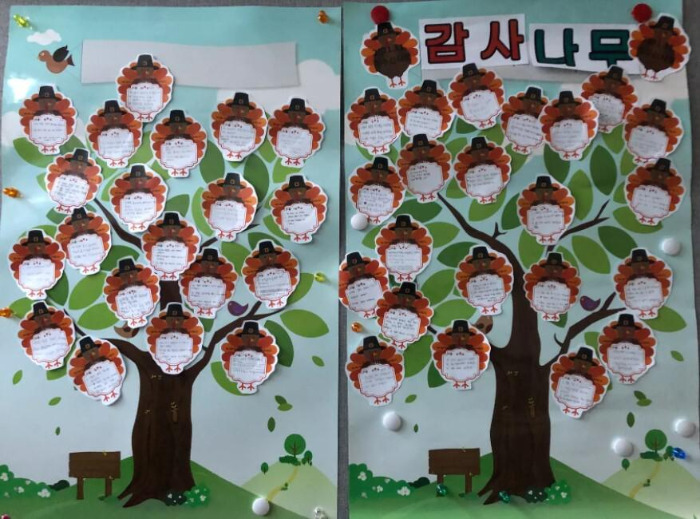 한국에서는 이미 지나가 버린 추석이었지만 미국의 학생들에게 추석에 대한 정보와 추억을 공유해 주기 위해 다양한 활동을 진행했다. 한국의 김 선생님께서는 한국의 추석을 미국 학생들에게 알려주는 활동과 감사나무를 통해 땡스기빙의 의미의 배워보는 수업을 가졌다. 감사 쪽지를 나무에 붙인 사진을 포스팅해 주셨는데 쪽지의 모양이 특이해서 자세히 보니 터키였다. 추수감사절 음식으로 빠질 없는 터키가 다닥다닥 붙어있는 감사나무 사진은 그 어떤 나무보다 귀여웠다.