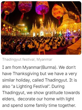 미국에서는 목~일, 4일간의 긴 휴일 덕분에 학생들도 나도 모두 들뜬 분위기로 이번 주를 보냈다. 미국으로 유학을 온 학생들은 함께 할 가족들이 근처에 있는 것은 아니었지만 친구 부모님 댁, 교수님 댁 등 주변 가족들과 함께 명절을 보낸 경우가 많았다. 하지만 개중에는 친구들과 함께 명절을 보낸 경우도 있었다. 그냥 기숙사에서 친구들과 함께 요리를 만들어 먹었다고 한 인도 학생은 한국음식을 만들어 먹으면서 한국의 명절 분위기를 내 보았다는 글을 올려 주어 반가웠다. 한 미얀마 학생은 추수감사절과 비슷한 미얀마 명절에 대해서 소개를 해 주어서 우리 온라인 게시판을 더 다채롭게 만들어 주었다.