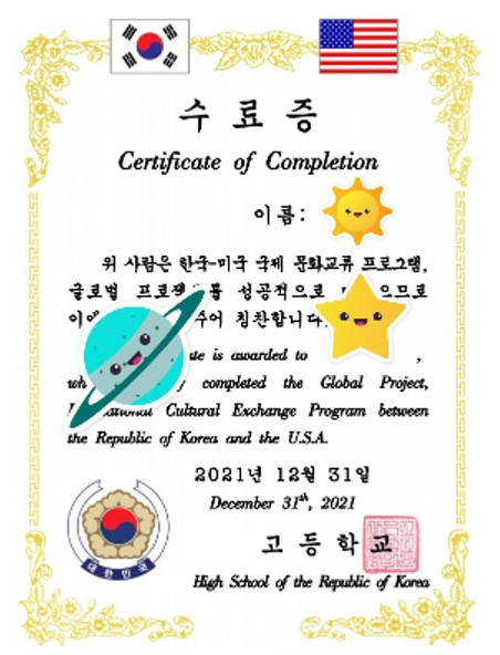 이제 글로벌 프로젝트의 내용을 모두 완료했고 수료식만을 남겨 두었다. 수료식에서 꼭 필요한 것 하나가 있었다. 바로 수료증! 수료증에 대해 고민하고 있었던 김 선생님께 한 가지 양식을 보내드리기로 했다. 몇 년 전 한글학교 행사 때 내가 만들어서 활용했던 수료증 파일을 조금만 손 보면 될 것 같았다. 뭐든지 샘플이 있으면 수정 보완하기는 훨씬 수월한 법. 만들어 놓았던 틀에 내용과 날짜, 학교명을 고치니 멋진 글로벌 프로젝트 수료증이 완성됐다.