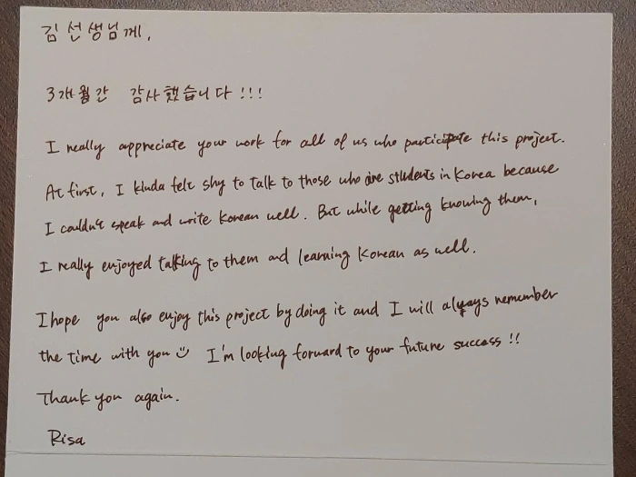 앞으로도 캠퍼스에서 보면 반갑게 인사를 하기로 하고, 단체 채팅방을 통해서도 가끔 연락을 주고받기로 했다. 그러던 중, 한 학생이 내게 줄 것이 있다면서 카드와 선물을 건넸다. 일본에서 온 리사 학생이었다. 한국어를 조금 공부했다면서 쓴 한국어 문장이 돋보였다. 나의 앞날을 응원해 준 메시지가 내게 큰 에너지를 주는 듯했다. 새해를 앞두고 이 멋진 카드를 받았으니 올해에는 뭔가 더 좋은 일이 생길 것 같은 느낌이 들었다.