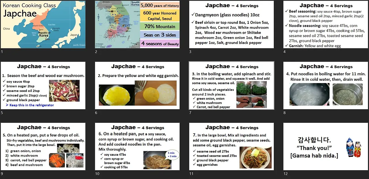 잡채 수업을 할 때 우리나라에 대한 소개도 간단히 하고 싶었고 집에서도 각자 만들어 먹을 수 있도록 인쇄물도 나눠주고 싶었다. 수업 시작 한 달 전부터 조금씩 조금씩 인쇄물에 담을 내용을 만들었다.