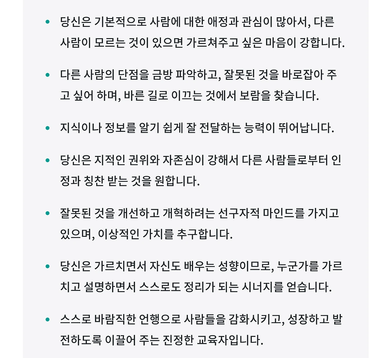 물론 나의 진로는 교사, 선생님으로 이미 정해진지 오래되었고 앞으로도 바꿀 생각이 없다만, 그래도 궁금하니 바로 클릭을 해 봤다. 결과는 아니다 다를까 예상한 바 대로의 결과가 나왔다. 혹시나 했지만 역시나였다. 가르치면서 행복을 느끼는 진정한 멘토, 교육형!