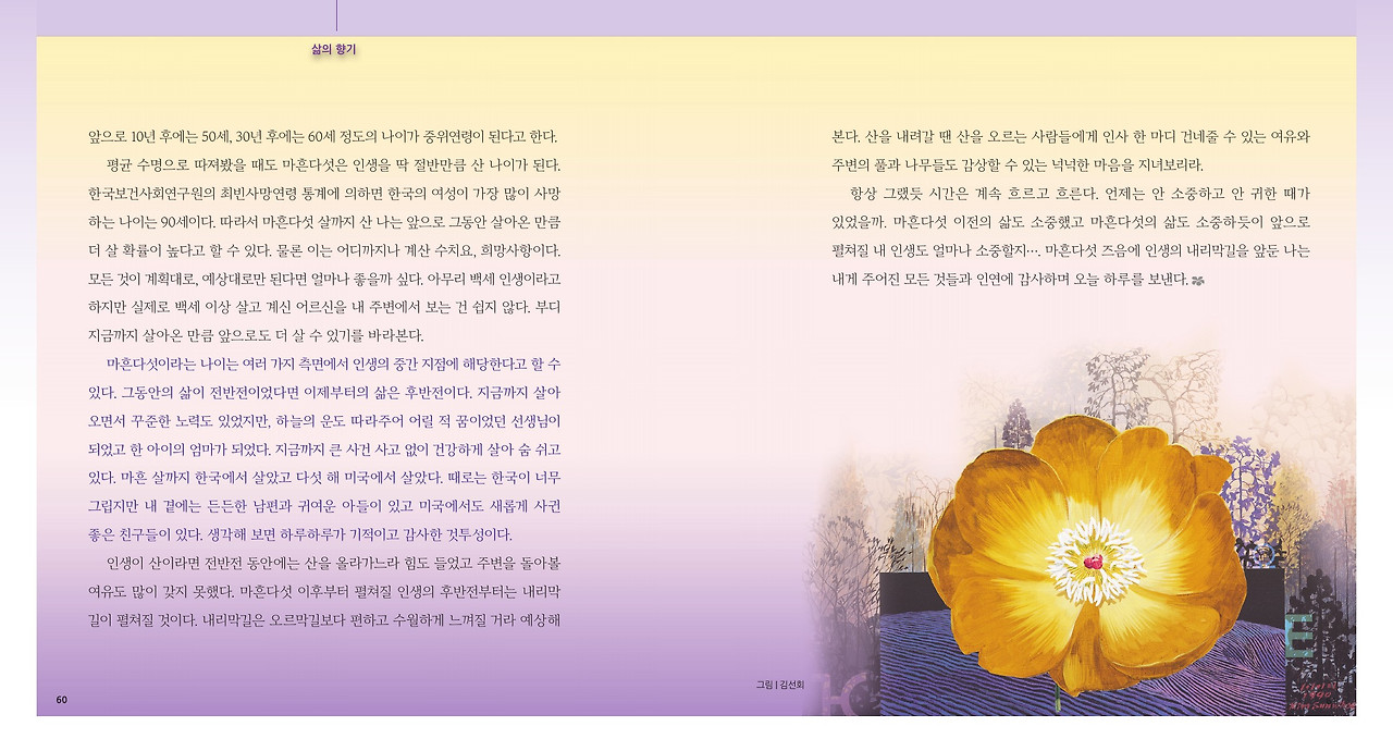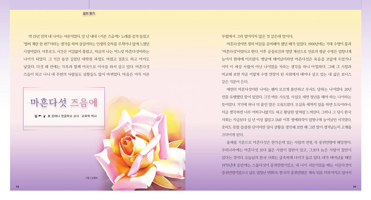 올가을에도 브런치를 통해 믿을 수 없을 만큼 좋은 소식을 받았다. 월간 에세이 편집장님께서 나의 브런치를 보고 에세이 기고를 제안해 주신 것이었다. 어떤 글을 실을까 고민하다가 8월에 새로 만든 브런치 매거진의 첫 글, 마흔다섯, 딱 좋은 나이의 내용이 내 마음에 들어왔다. 올 한 해 내내 마흔다섯이라는 나이가 의미심장하게 다가오고 있던 차에 이 내용을 에세이 매거진에 실으면 좋겠다는 생각이 들었다. 앞 뒤 부분의 내용을 보완하고 전체적으로 다듬어서 편집장님께 원고를 보내드렸다. 그리고 한 번에 오케이 승낙을 받았다. 야호!