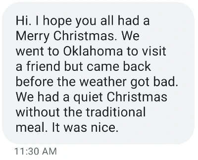 이번 크리스마스 휴가는 조용하게 지나가고 있다. 차가운 북극 바람이 미국 전역을 향해 내려오면서 생긴 겨울 폭풍이 심상치 않다. 이 영향으로 여러 지역의 날씨가 좋지 않다. 기온이 크게 떨어졌고 더불어 교통 상황도 많이 안 좋아졌다. 주변 친구들도 집에서 조용하게 크리스마스를 보내거나 조금 이른 여행을 다녀온 경우가 많았다. 크리스마스 이브와 크리스마스 날에 문자를 보내 준 미국 친구들도 예외는 아니었다. 우리 가족도 잠시 마트에 다녀온 것 이외에는 주말 내내 집에서 머물렀다.