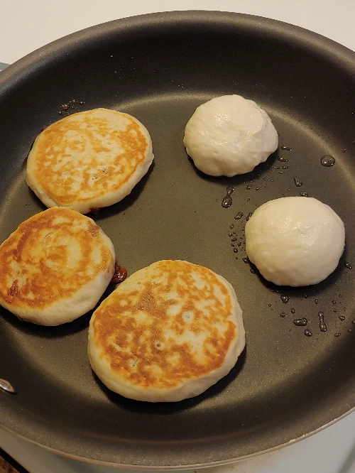 집에서 호떡을 구우면 기름을 적게 쓸 수 있어서 좋다. 우리 가족은 튀기 듯 만드는 빵빵한 호떡보다는 기름기가 적은 납작 호떡을 선호한다. 코팅팬을 쓰면 약간의 기름만으로도 노릇노릇 호떡이 잘 구워지기에 문제없다. 호떡 반죽에 속을 한 숟가락 넣고 잘 오므린 뒤 팬에 살포시 얹는다. 약간의 시간이 지나고 지글지글 소리가 나면 뒤집은 후 누르개로 꾹 누를 차례다. "똘똘아, 얼른 와 봐. 호떡 누르고 싶으면!" 쏜살같이 달려온 똘똘이는 호떡을 지긋이 잘도 누른다. "엄마, 너무 먹고 싶어요. 엄청 맛있을 것 같아요." 벌써부터 난리다.