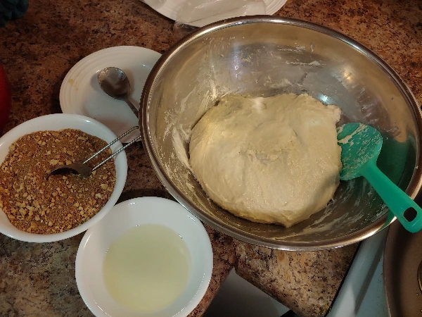 이스트로 부풀린 호떡이 더 부드럽고 우리가 흔히 사 먹는 호떡의 식감과 비슷하기에 여유 시간이 있을 때면 항상 이스트로 호떡을 만든다. 밀가루만 쓰는 호떡도 맛있지만 좀 더 쫄깃한 맛을 더하고 싶어 30% 정도의 찹쌀가루를 섞어 주었다. 속 재료는 흑설탕과 시나몬 가루에 밀가루 한 숟가락, 거기에 구운 땅콩 다진 것을 넣어서 만들었다. 밀가루 한 숟가락을 속 재료에 넣으면 설탕이 뭉치는 것을 방지해 주어서 좋다. 똘똘이는 호떡 구울 때 누르개로 누르는 것을 직접 해 보고 싶다며 미리부터 내게 당부를 했다. 나의 대답은 물론 오케이!