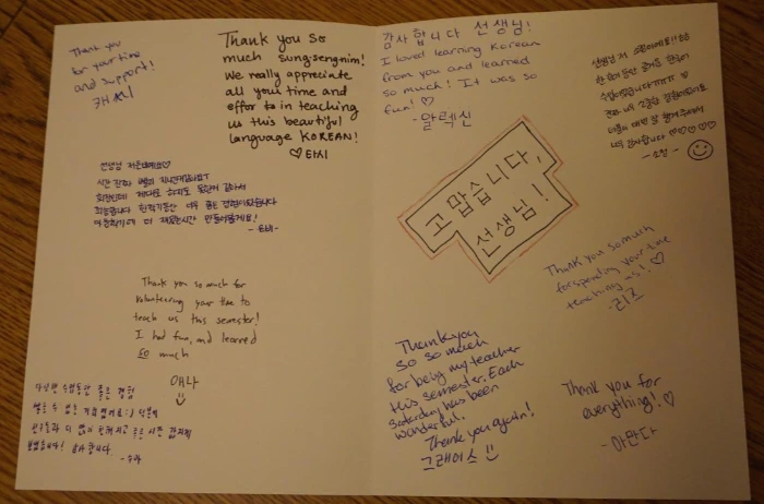 클럽활동으로 운영하는 토요 한국어 수업이었지만 조금씩 학생들의 한국어 실력이 늘어가는 것을 느낄 수 있었다. 만날 때 "안녕하세요?", 헤어질 때 "안녕히 계세요." "안녕히 가세요." 고개를 숙이며 인사를 하는 모습은 한국의 학생들과 별반 차이가 없어 보였다. 캠퍼스를 걷다가도 가끔 클럽 회원인 미국 대학생들이 내게 "안녕하세요? 선생님!" 인사를 건네기도 했는데 그럴 땐 더 반갑고 뿌듯한 마음이 들었다.