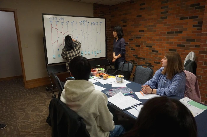 토요일에 실시한 한국어 수업은 늘 예상보다 많은 학생들이 참여를 해 주었다. 팬데믹 전까지 매 학기 5~7번의 수업을 진행했는데 수업을 할 때마다 10~15명 이상의 학생들이 모였다. 한국어 수준은 모두 기초이기에 영어로 한국어를 가르쳐야 한다는 부담도 만만치 않았지만 교사로서 가르칠 수 있는 기회가 참 소중했고 몬태나에서도 함께 할 수 있는 학생들이 있어서 좋았다. 매 수업 한국 대학생들이 적극적으로 함께 해 준 덕분에 우리들의 한국어 수업은 더 활기차고 재미있을 수 있었다.