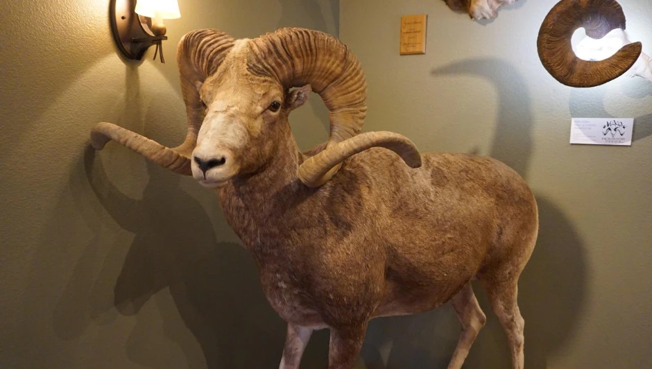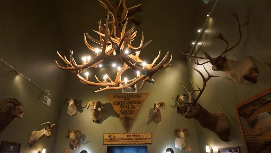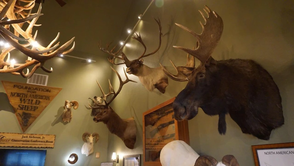 몬태나 야생 양 협회 건물 안에 있는 많은 뿔과 박제 야생동물들