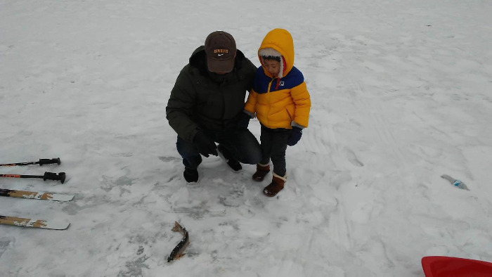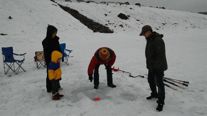 도착해서는 회장님의 차에서 얼음낚시 도구들을 꺼내어 얼어있는 저수지 아래로 내려갔다. 얼음낚시는 한 번도 안 해본 터라 아들뿐만 아니라 우리 가족은 모두 들뜬 기분이었다. 해발 2000m에서 얼음낚시를 즐기려면 일단 구멍부터 파야 했다. 생각보다 얼음의 두께는 정말 두터웠다. 저수지로 내려갈 때 잠시나마 ‘살얼음이 있으면 어떡하지?’했던 생각은 완전히 기우였다.