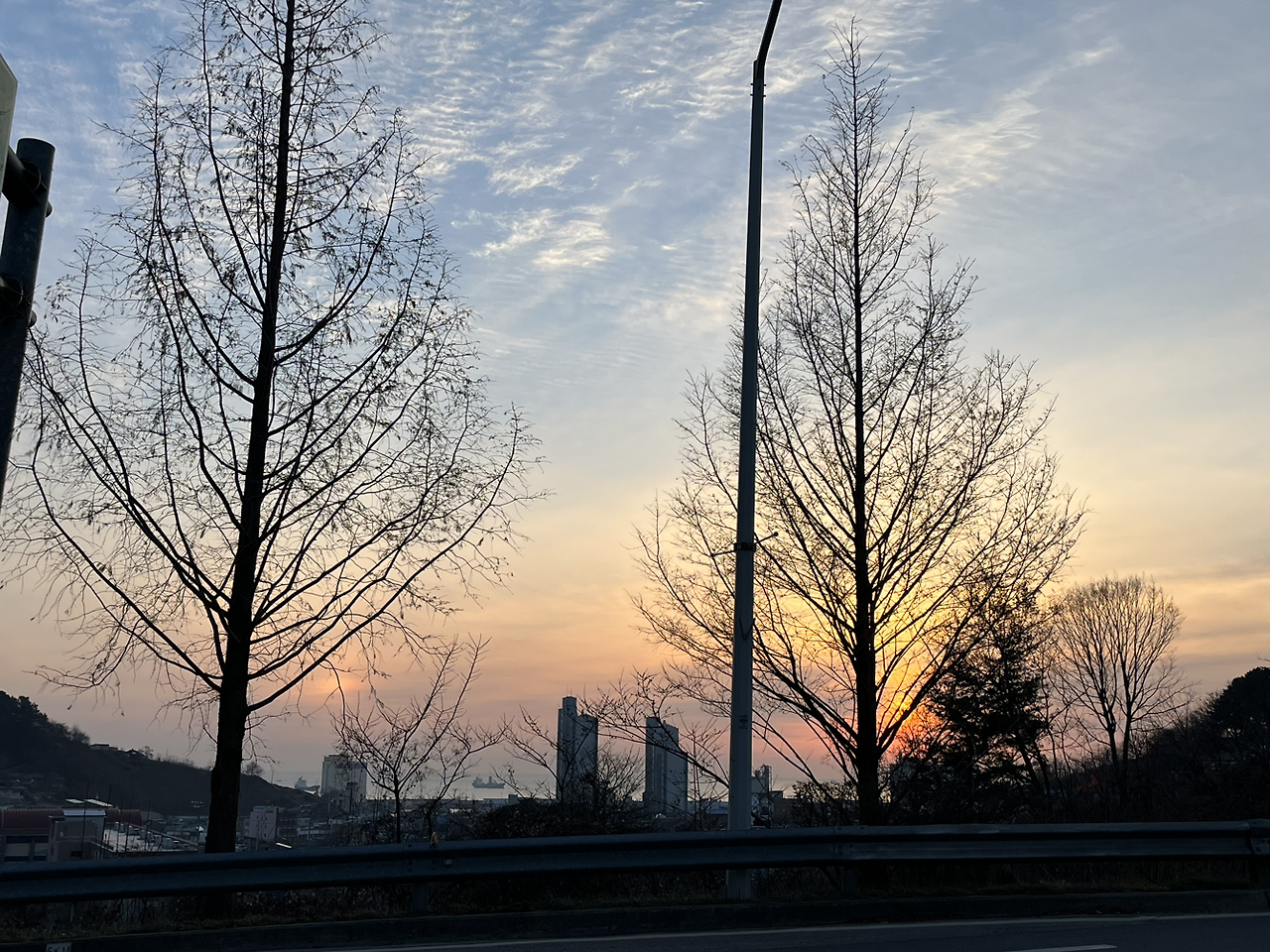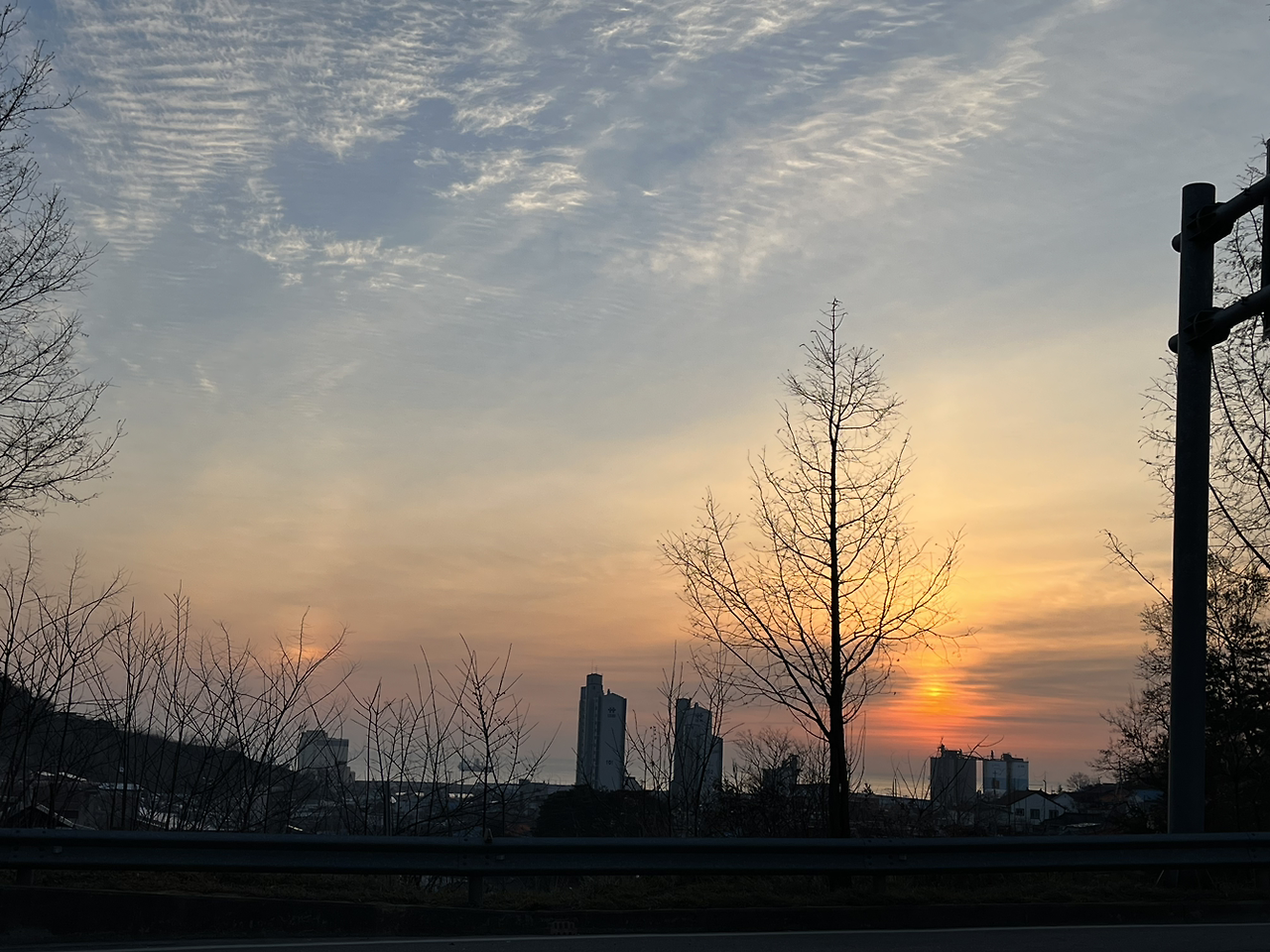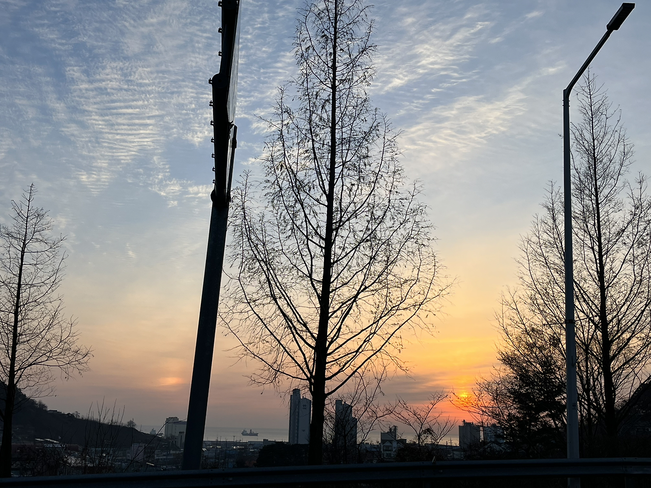 일을 내려놓은 지금은 여유롭게 주변을 둘러보며 운전한다. 아침해가 바다에 비춰 금빛 물결을 일렁이는 모습은 마음을 여유롭게 하고, 아침이 주는 기대로 충만한 마음이다. 출장 전 마지막 근무일 아침음 날이 흐려 해가 늦게 떴다.