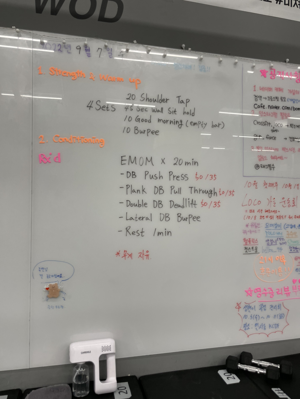 오늘도 재밌는 크로스핏 오늘은 버피나와서 ㅋㅋㅋㅋㅋ 힘들었지만 ㅎㅎ 쌤한테 엎드려 절받기 칭찬받음 헤레 라운드 갈수록 잘했다