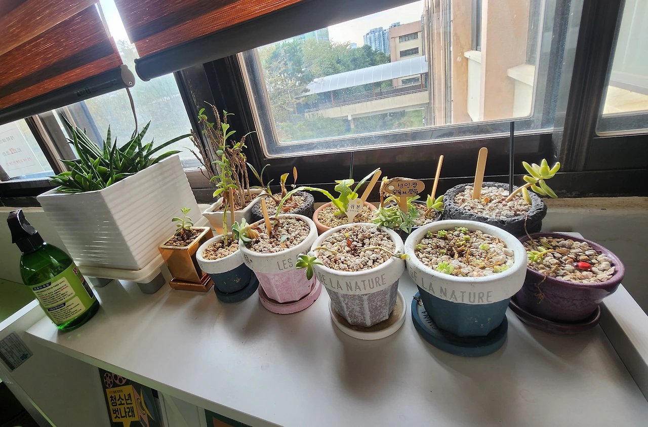 도서관 안에는 비교적 작은 화분에서 다육식물들이 자라고 있고, 도서관 옆 공강실에는 큰 화분들이 놓여 있다.