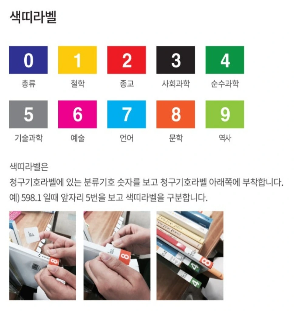 색띠 라벨이란 도서 분류를 위해 사용하는 10가지 색상 라벨을 말한다.