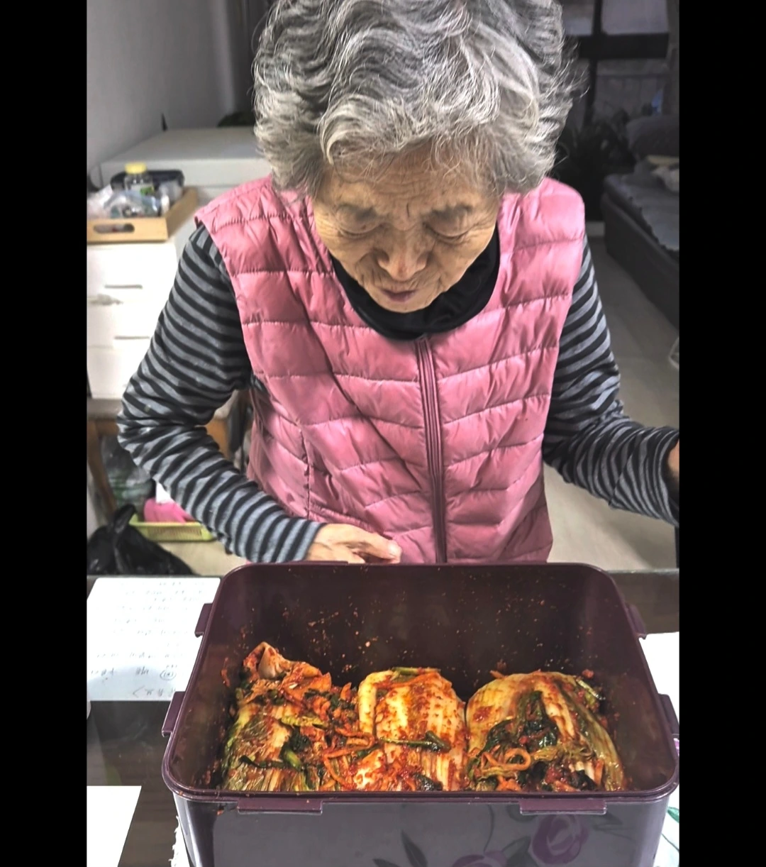 엄마에게 김치를 건네드리자