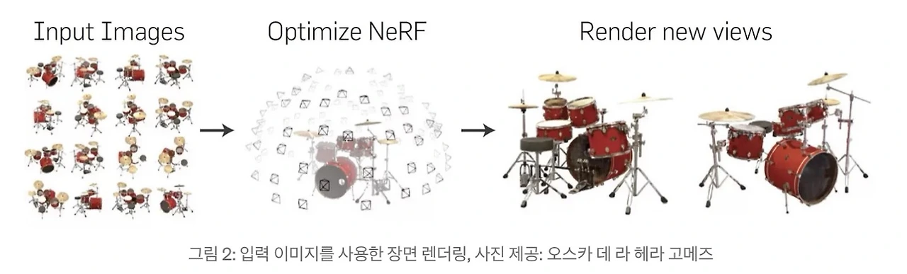 다양한 각도에서 촬영한 2D 이미지로 3D 장면을 구성할 수 있다. 장면을 몇 초 만에 생성, NeRF 모델을 더 오래 학습할수록 결과적으로 3D 렌더링이 더 세밀해진다.