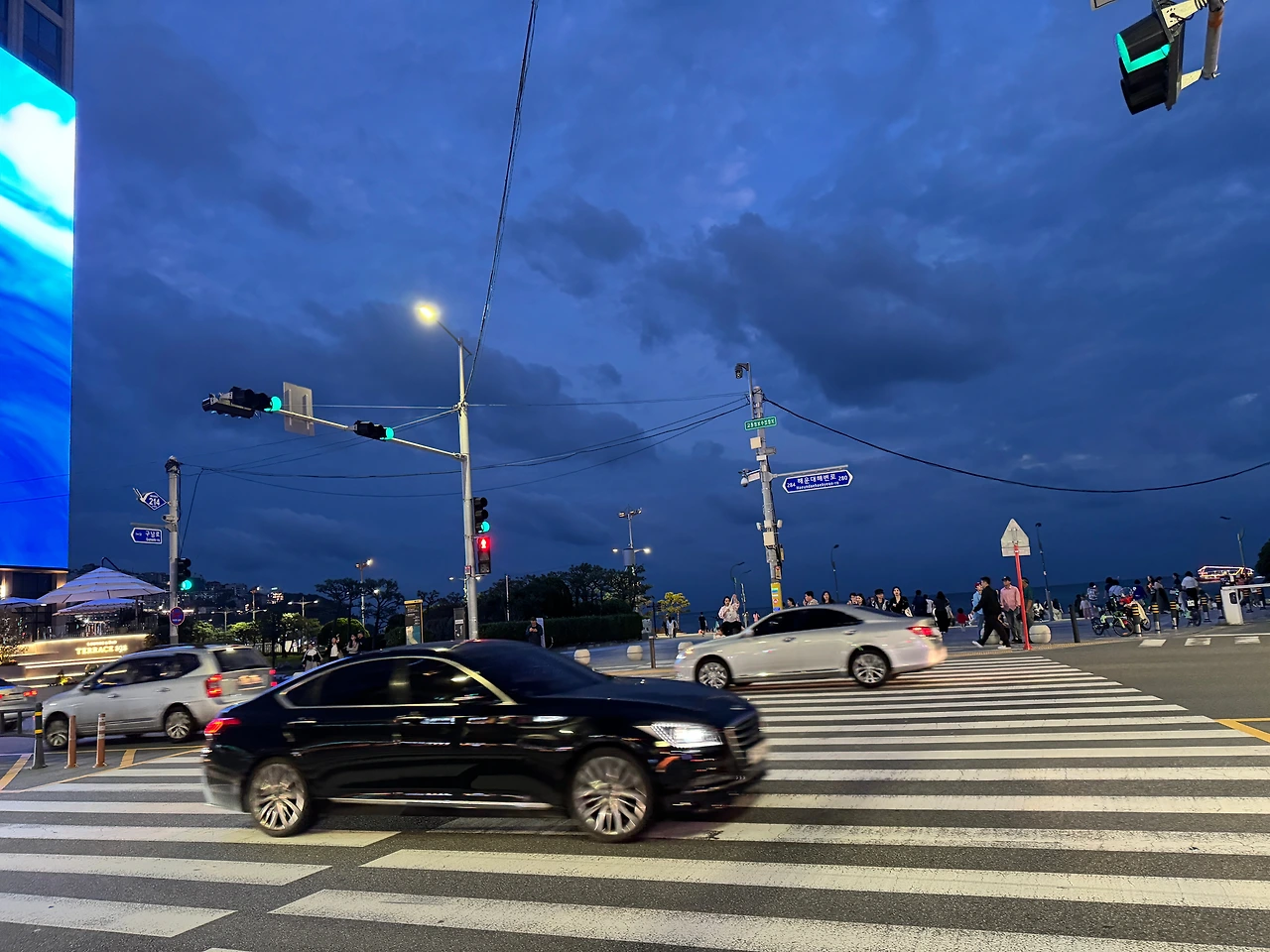 길을 건너 마주한 풍경은 어두운 남색의 밤바다색과 해가 지고 어둠이 몰러온 구름빛을 함께 머금고 있다.