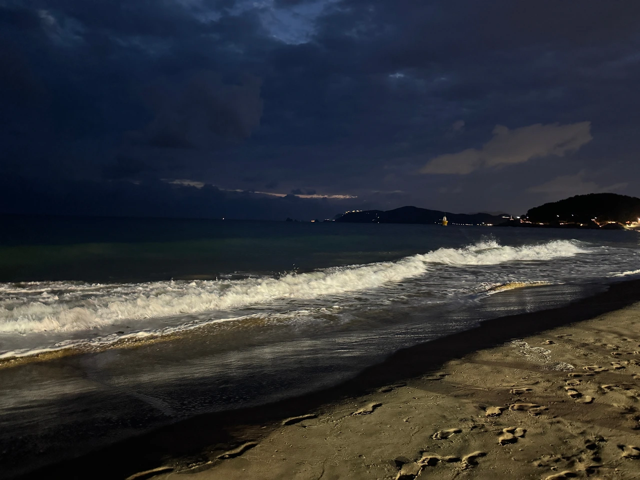 자연이 만들어낸 바다빛과 해운대 건물들이 만들어낸 옅은 노란색 형광빛이 모래사장에 비추면서