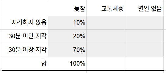 이제 표를 채워봅시다. 핵심은 한 번에 한 열씩 채워나가는 겁니다. 먼저 '늦잠'이라는 가설이 참일 때, 나올 수 있는 결과들의 분포를 생각해봅시다. "늦잠을 100번 잤다면, 지각하지 않은 경우가 몇 번, 30분 미만 지각이 몇 번, 30분 이상 지각이 몇 번일까?" 경험상 각각 10번, 20번, 70번 정도인 것 같습니다. Ep.7에서 이야기했던 것처럼, 같은 원인(늦잠)에서도 우연적 불확실성 때문에 매번 다른 결과가 발생할 수 있죠. 이렇게 하면 '늦잠' 열의 세 칸이 P(지각하지 않음|늦잠) = 10%, P(30분 미만|늦잠) = 20%, P(30분 이상|늦잠) = 70%로 채워집니다. 한 열의 확률을 모두 더하면 당연히 100%가 되겠죠.