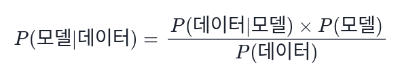 여기서 '가설' 자리에 '모델'을 넣으면 다음과 같이 모델 공간에 적용된 베이즈 정리가 됩니다: