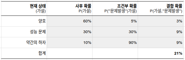 1년 내 문제 발생 확률 열은 P(미래 데이터|가설), 즉 각 상태에서 문제가 발생할 조건부 확률입니다. 이 두 확률을 곱하면 P(가설) × P(미래 데이터|가설) = P(가설, 미래 데이터), 즉 결합 확률이 됩니다. '양호하면서 동시에 문제가 발생할 확률'이 3%인 식이죠. 그리고 세 가설이 서로 겹치지 않고 모든 가능성을 포괄하므로, 결합 확률을 모두 더하면 P(미래 데이터) = 3% + 9% + 9% = 21%가 됩니다. 이것이 전체 확률의 법칙입니다.