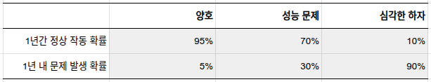 결정을 못하겠더라고요. 제가 매긴 확률은 노트북의 지금 상태에 대한 추측이잖아요. 하지만 정작 알고 싶은 건 '이걸 사면 앞으로 어떤 일이 벌어질까'였거든요. 1년 뒤에도 잘 쓰고 있을지, 아니면 고장 나서 후회하고 있을지. 그래서 한 단계 더 생각해 봤어요. 정말 좋은 상태라면 1년은 거뜬히 쓸 테고, 성능 문제가 있다면 1년을 못 버티고 말썽이 날 거고...
