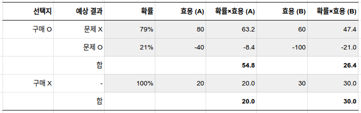 구매자 A의 효용 함수를 봅시다. 노트북이 정상 작동하면(79%) 효용은 +80입니다. 새 제품 대비 절약한 돈으로 다른 것을 살 수 있으니까요. 문제가 발생하면(21%) 효용은 -40입니다. 돈은 아깝지만 감당할 만한 손실이죠. 각 결과의 확률과 효용을 곱해서 더한 기대효용을 계산하면 0.79 × 80 + 0.21 × (-40) = 54.8입니다. 구매하지 않는 것의 효용이 +20이라면, 구매가 훨씬 유리합니다.