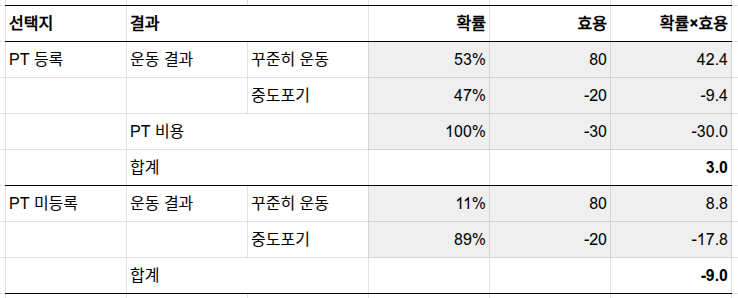 3. 가치: 꾸준한 운동 +80, 중도포기 시 자책 -20, PT 비용 -30