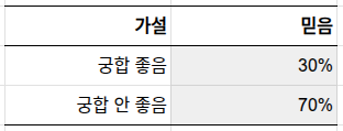 그렇다면 미용실을 바꾸면 어떻게 될까요? 먼저 새 미용실 궁합이 좋을 확률을 정해야 합니다. 가본 적 없는 미용실이니 특별한 정보가 없습니다. 여기서는 궁합이 좋을 확률과 안 좋을 확률을 각각 50%로 놓겠습니다.