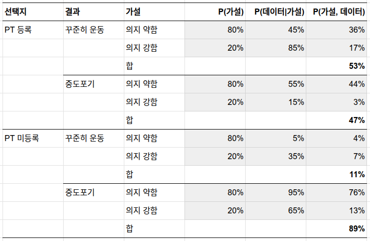 PT를 등록하는 게 낫네요! 이제 '의지 약함 80%'를 50%로 바꿔서 다시 계산해 보세요. 결론이 바뀌나요?