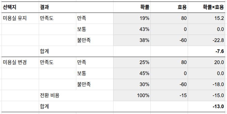 미용실을 유지했을 때(만족 19%, 보통 43%, 불만족 38%)와 비교하면, 바꿨을 때 만족 확률은 올라가고 불만족 확률은 내려갑니다.