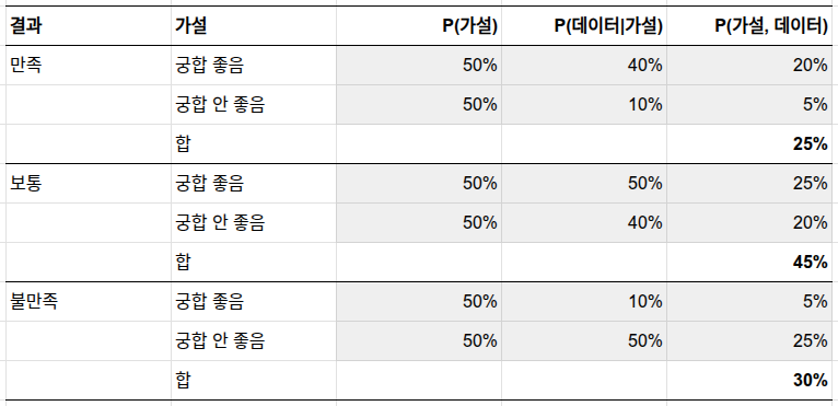 우리가 원하는 것은 미용 결과의 확률입니다 — 만족/보통/불만족 각각이 얼마나 가능한지요. 베이지안 모델은 가설과 결과의 결합 확률을 다룹니다. 곱셈 규칙에 의해 P(가설, 결과) = P(가설) × P(결과|가설)인데, P(가설)은 1단계에서 정한 가설 확률이고 P(결과|가설)은 데이터 모델(위 표)입니다. 예를 들어, 궁합이 좋으면서 만족하는 경우의 결합 확률은 30% × 40% = 12%입니다.