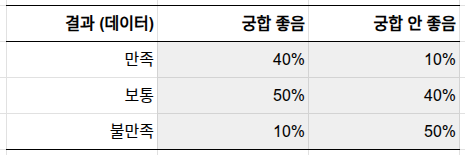 = P(궁합 좋음) × P(만족|궁합 좋음) + P(궁합 안 좋음) × P(만족|궁합 안 좋음)