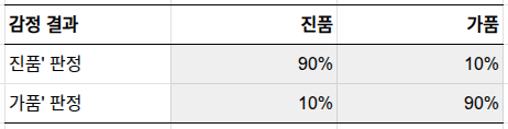 이번에는 전문가 감정을 받는 경우(선택지 2)입니다. 5만 원을 내고 90% 정확도의 감정을 받는다고 해봅시다. 여기서 90% 정확도란 진품을 '진품'으로, 가품을 '가품'으로 정확히 판정할 확률이 90%라는 뜻입니다. 10%는 틀릴 수 있죠. 실제 감정에서는 두 오류율이 다르지만(대개 정교한 가품을 잡아내는 쪽이 더 어렵습니다), 여기서는 설명을 단순화하기 위해 양쪽 모두 90%로 두겠습니다.