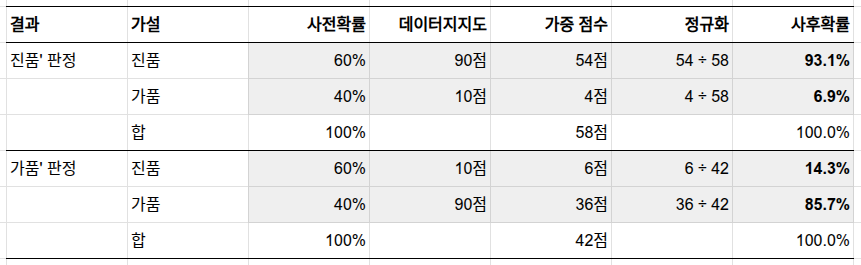 먼저 '진품' 판정이 나온 경우를 생각해 보죠. 앞서 감정 결과를 예측할 때는 조건부 확률을 순방향으로 사용했습니다. 이번에는 감정 결과를 관찰한 후 제품 상태에 대한 믿음을 업데이트하는 역방향이므로, 같은 값을 데이터 지지도로 읽습니다. '진품' 판정이라는 데이터가 두 가설을 각각 얼마나 지지하는지 보면, 진품 가설은 90점, 가품 가설은 10점입니다. 베이즈 정리에 따르면, P(진품|'진품' 판정) = (90점 × 60%) / (90점 × 60% + 10점 × 40%) = 54 / 58 = 93.1%입니다. 따라서 P(가품|'진품' 판정) = 6.9%입니다. 같은 절차를 '가품' 판정 케이스에도 동일하게 적용해 아래 표에 함께 정리했습니다.