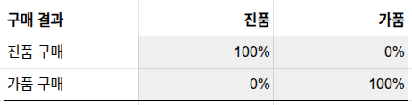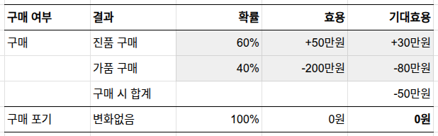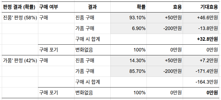 '진품' 판정을 받으면 구매(+32.8만 원)가 포기(0만 원) 보다 유리하고, '가품' 판정을 받으면 포기(0만 원)가 구매(-164.3만 원) 보다 훨씬 유리합니다.