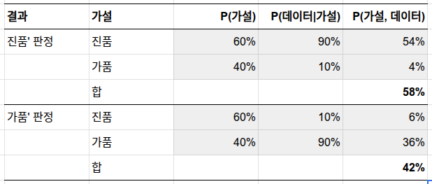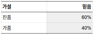 1단계: 믿음 (현재 상황 파악). 데이터(제품 설명, 제품 사진, 판매자의 판매 이력 등)를 바탕으로 제품 상태에 대한 현재의 믿음을 적어봅니다. 판매자가 아주 낯설거나, 제품 가격이 시세보다 현저히 싸다면 이 단계에서부터 진품 확률을 낮게 잡아야겠죠. 여기서는 진품일 확률 60%, 가품일 확률 40%로 정하겠습니다.