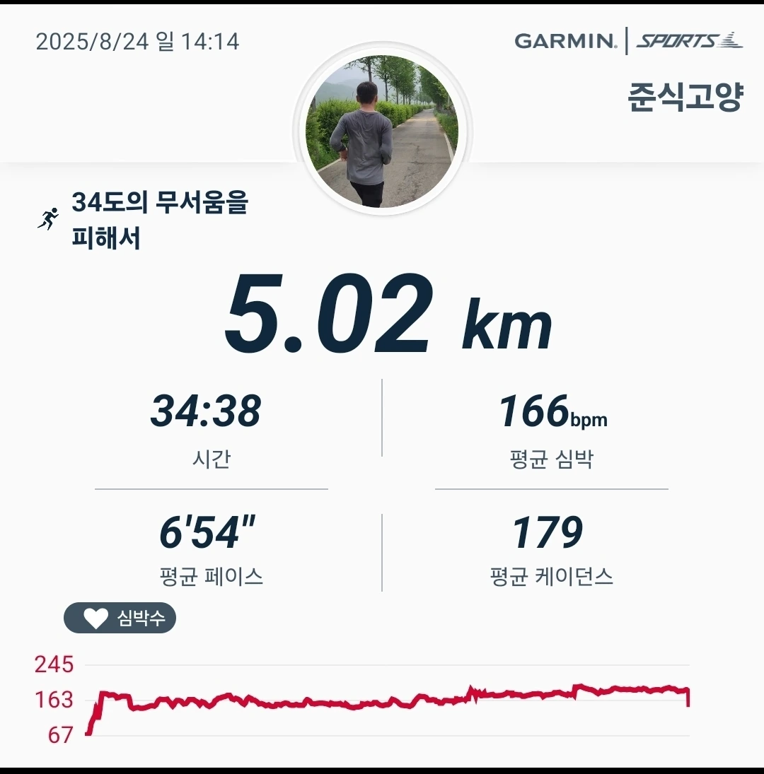 오후는 다시 여름 같았다. 34도의 무더위 속에서 야외 대신 헬스장 트레드밀을 택했다. 땀이 바닥으로 흘러내릴 만큼 힘들었지만, 그 흔적은 오늘을 살아낸 증거가 되었다.