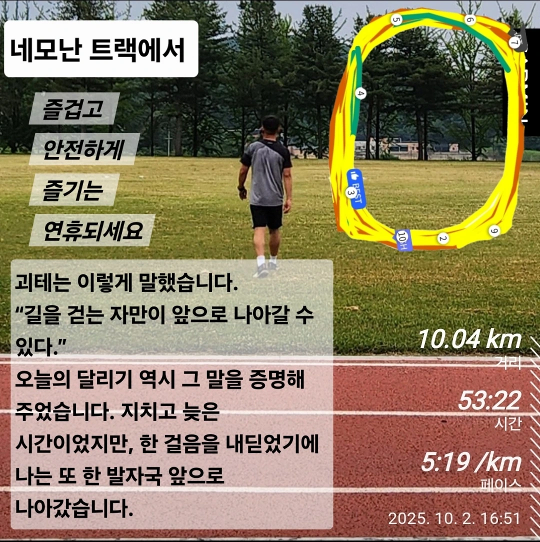 연휴를 앞두고 하루 종일 바쁜 일정이 이어졌습니다. 새벽 일찍 출근해 업무를 처리하고, 장거리 운전까지 이어지니 몸이 무겁고 지친 하루였습니다. 하지만 늦은 시간이 되어도 결국 운동화를 신고 트랙에 섰습니다.