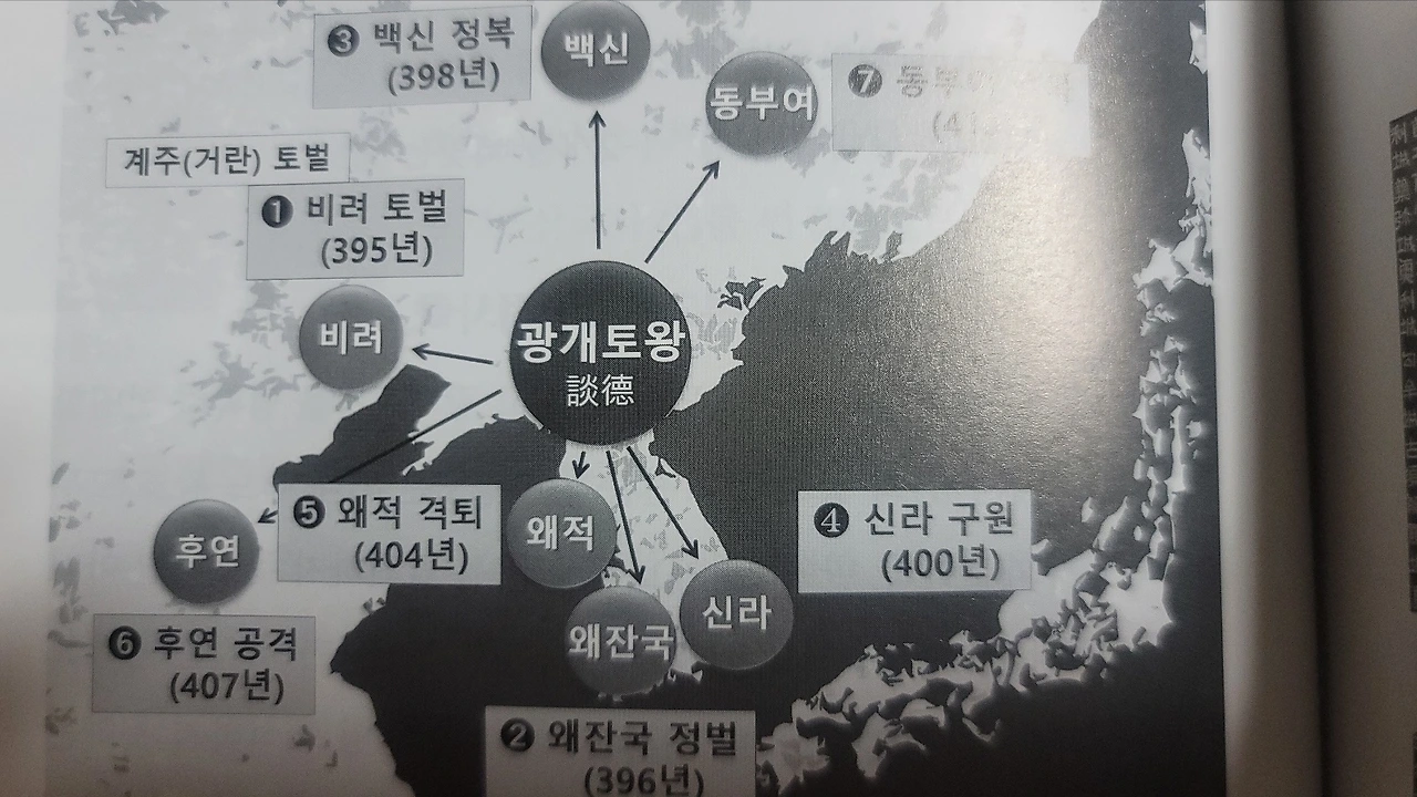 광개토왕에 관한 이야기는 참으로 흥미진진하다. 광개토왕이 정복 군주로서 고구려의 영토를 확장하는 데 막대한 영향을 미쳤다는 것을 우리 모두는 잘 알고 있다. 그럼에도 이런 역사가 김부식의 <삼국사기>에서는 의도적으로 무시되고 폄훼되어 있다. 그것은 삼국을 통일한 신라의 입장과 중국에 대한 사대주의 역사관 때문이다. 광개토왕의 전승 기록은 <광개토왕릉비>가 발견되고, <고구려사략>의 상세한 기록을 통해서 이루어졌다. <광개토왕릉비>에 드러난 광개토왕의 정복 사업은 비려, 왜잔국, 백신, 신라, 왜적, **, 동부여다. 이 책의 262 쪽에는 상세한 지도가 실려 있다. (사진 참조) 이 중에서 우리의 관심을 끄는 것은 <영락 6년 왜잔국 정벌> 부분이다. 저자에 따르면 이 사건은 한반도 역사의 물줄기를 송두리째 바꿔놓았다. 광개토왕은 396년 몸소 수군을 이끌고 서남부 지방에 위치한 왜잔국(倭殘國)을 쑥대밭으로 만든다. 당시는 양강인 고구려와 일본이 백제와 신라를 사이에 두고 서로의 영향력을 확충 하던 시기다. 일제는 <광개토왕릉비> 탁본을 가지고 편집한’ 쌍무가목본’을 가지고 왜가 신묘년에 건너와 백잔과 신라를 파했다는 증거로 삼았다. 그들은 이를 근거로 고대 일본이 한반도 남쪽지방을 점령 통치했다고 하는, 이른바 ‘임나본부설’을 주장했다. 일제의 식민지를 정당화하기 위한 식민사관의 결정체이다. 하지만 이 사건의 본질은 한반도 서부로 남하한 부여기마족의 후예들이 광개토왕의 공격을 받아 다시 일본열도로 넘어가 ‘야마토’ 정권을 탄생시킨 것이다. 여기 나오는 ‘왜’는 일본의 왜가 아니라 한반도 남쪽에 위치한 왜임을 분명히 알아야 한다.