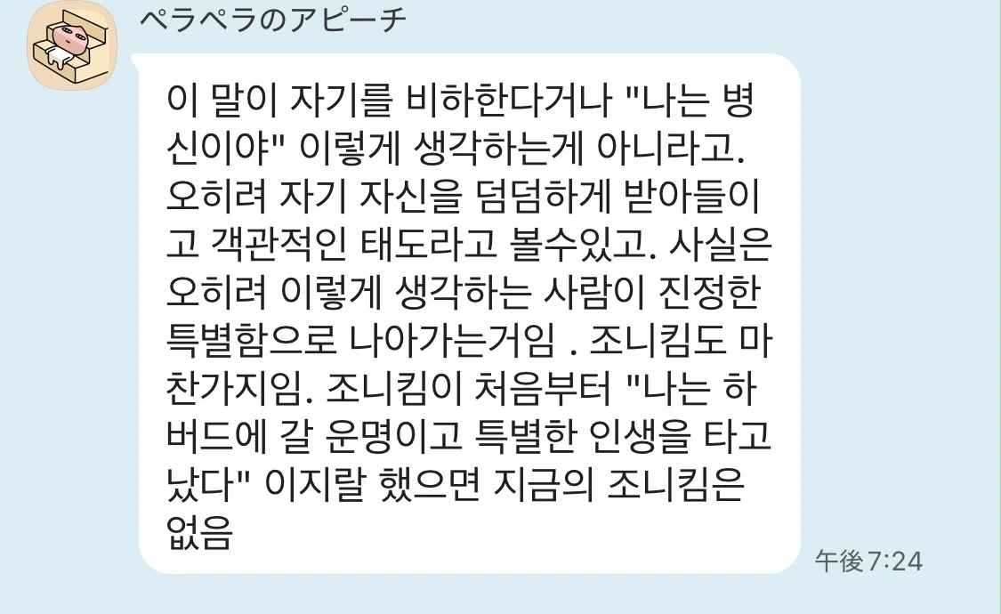 부정적인 것이 꼭 나쁜 것만은 아니며, 오히려 새로운 인연과 기회를 만나게 되기도 한다. 이에 덧붙여, 자기 자신을 특별하게 여기지 않고(스스로를 못난 사람이라고 여기는 것이 아님) 가벼운 마음으로 이것저것 시도하다 보면 역설적으로 특별한 사람이 될 수 있다고 생각한다. 그렇기에 살아가면서 마주하는 삶의 순간을 있는 그대로 바라보고, 지금 이 순간을 살려고 노력하게 된다.