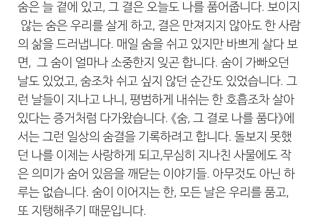 소중한 글벗님들, 이 글을 마지막으로 브런치북《숨, 그 결로 나를 품다》를 마무리 지으려 합니다.