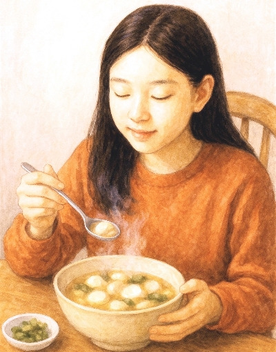딸아이가 식탁에 앉아 국물을 뜨기 시작했다.